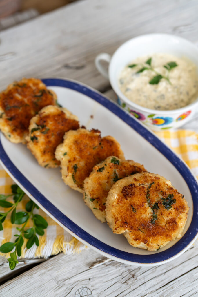 Podajemy z sosem tatarskim i ziemniakami lub ryżem.