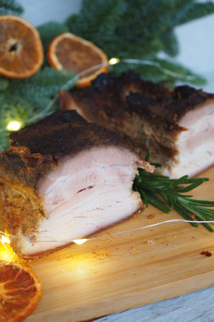 Następnego dnia nagrzewamy piekarnik do temperatury 190 stopni. Do garnka z boczkiem wlewamy wodę, przykrywamy i pieczemy około 2 godziny. W trakcie pieczenia patrzymy czy nie brakuje wody ( dolewamy jak będzie mało) i polewamy boczek sosem.