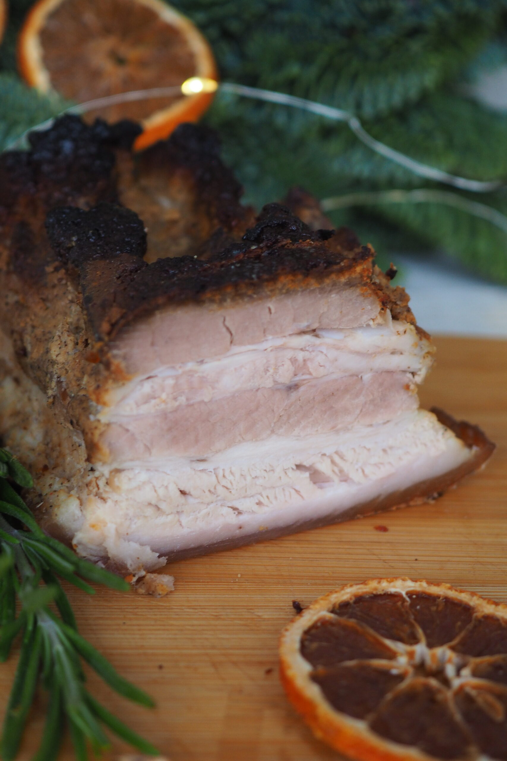 Następnego dnia nagrzewamy piekarnik do temperatury 190 stopni. Do garnka z boczkiem wlewamy wodę, przykrywamy i pieczemy około 2 godziny. W trakcie pieczenia patrzymy czy nie brakuje wody ( dolewamy jak będzie mało) i polewamy boczek sosem.