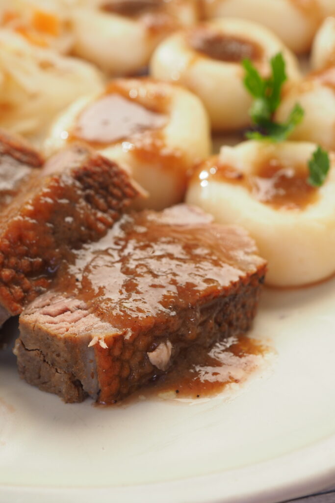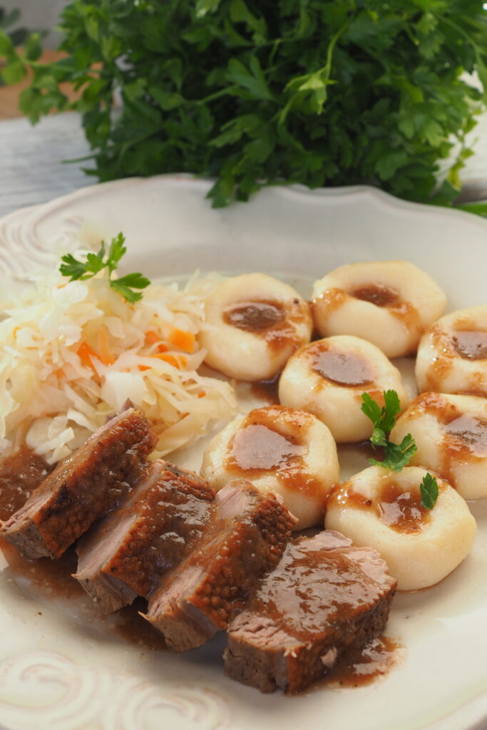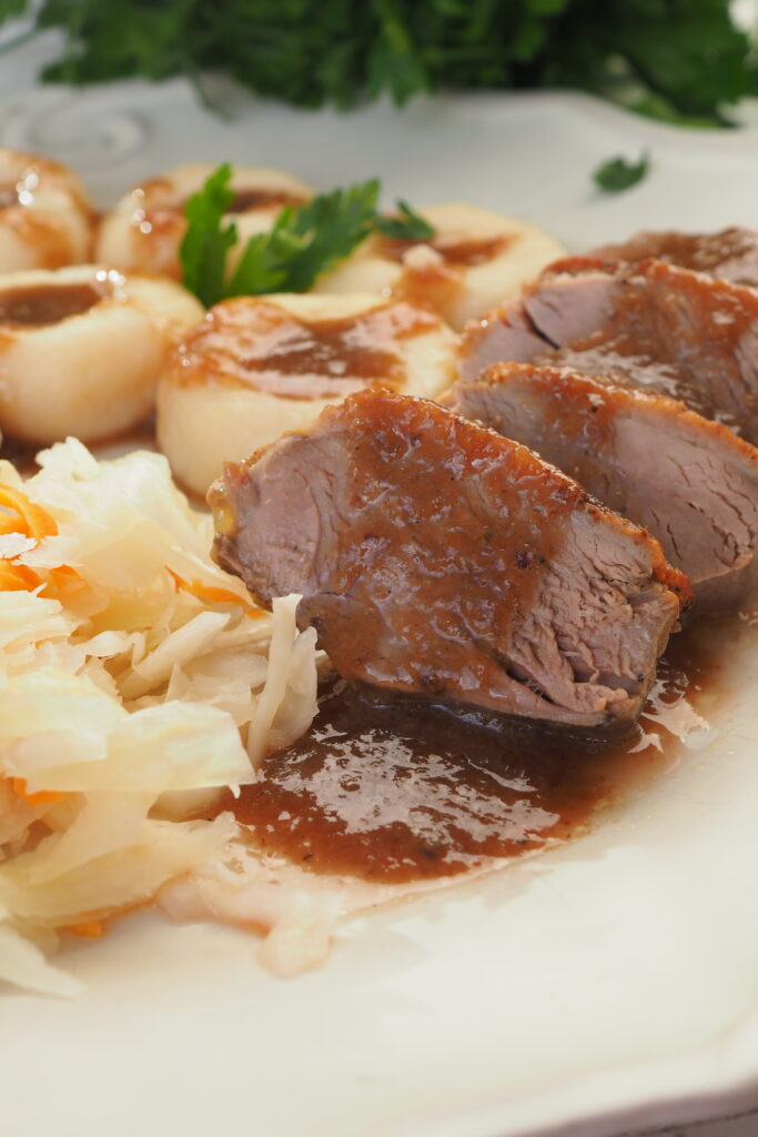 Podajemy z kluskami śląskimi i surówką z kiszonej kapusty lub sałatką z buraczków.
