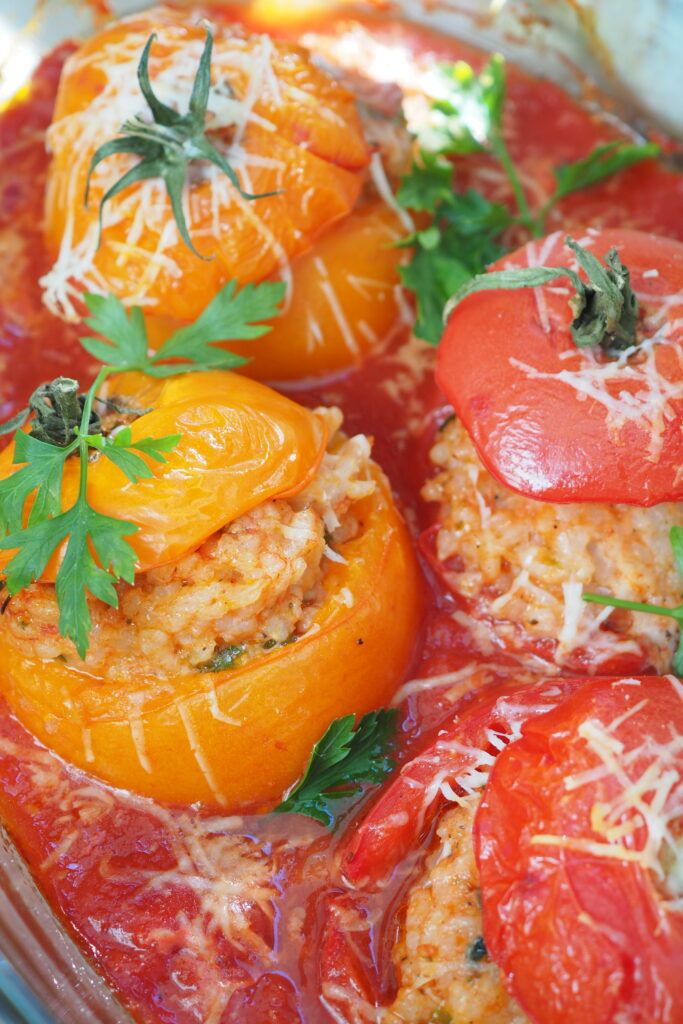 Pomidory faszerowane ryżem i mięsem w sosie pomidorowym