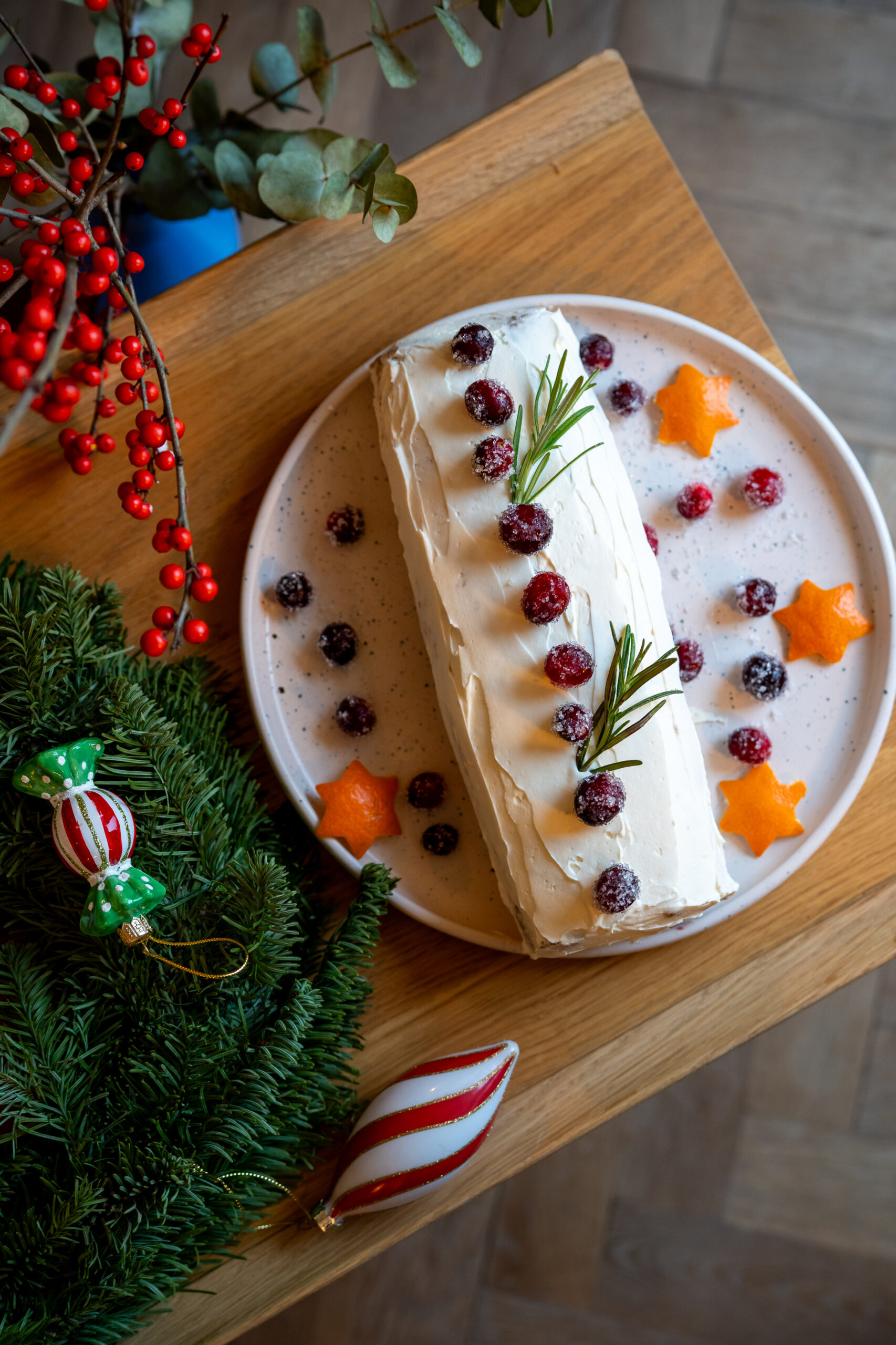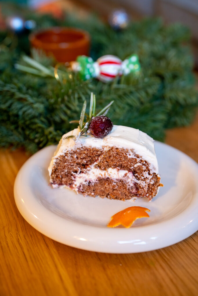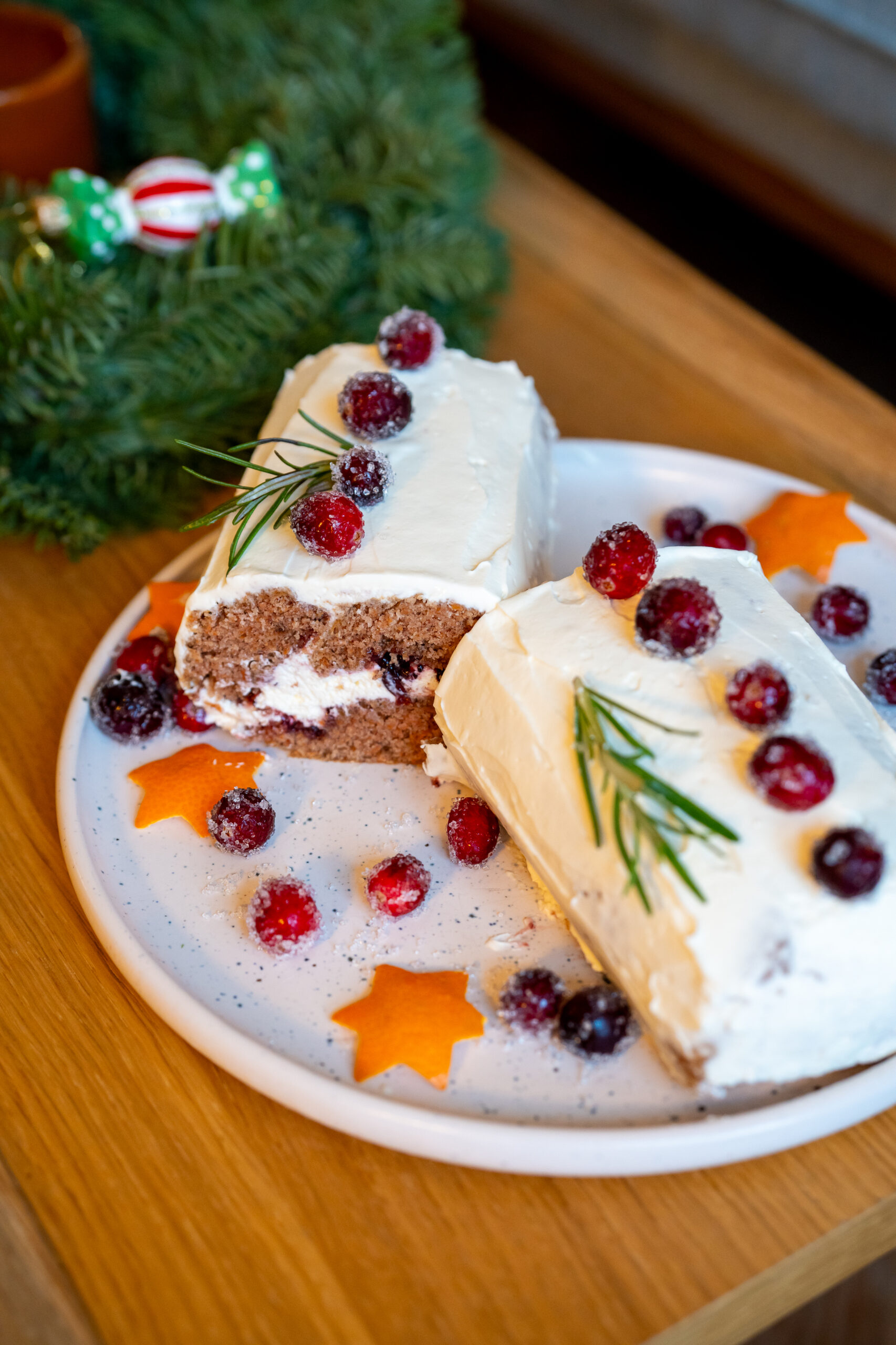 Dodanie do ciasta trochę przyprawy piernikowej i cynamonu, powoduje, że ciasto pachnie świętami. Krem mascarpone i konfitura z czarnej porzeczki dodają wyjątkowego koloru i smaku