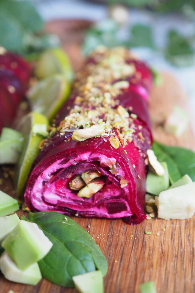 Na folii spożywczej układamy plasterki buraka, tak aby zachodziły na siebie. Doprawiamy solą i pieprzem. Na buraki smarujemy ser kozi i posypujemy rozdrobnionymi pistacjami. Zwijamy całość w rulon i przechowujemy co najmniej godzinę w lodówce a najlepiej przygotować dzień wcześniej.