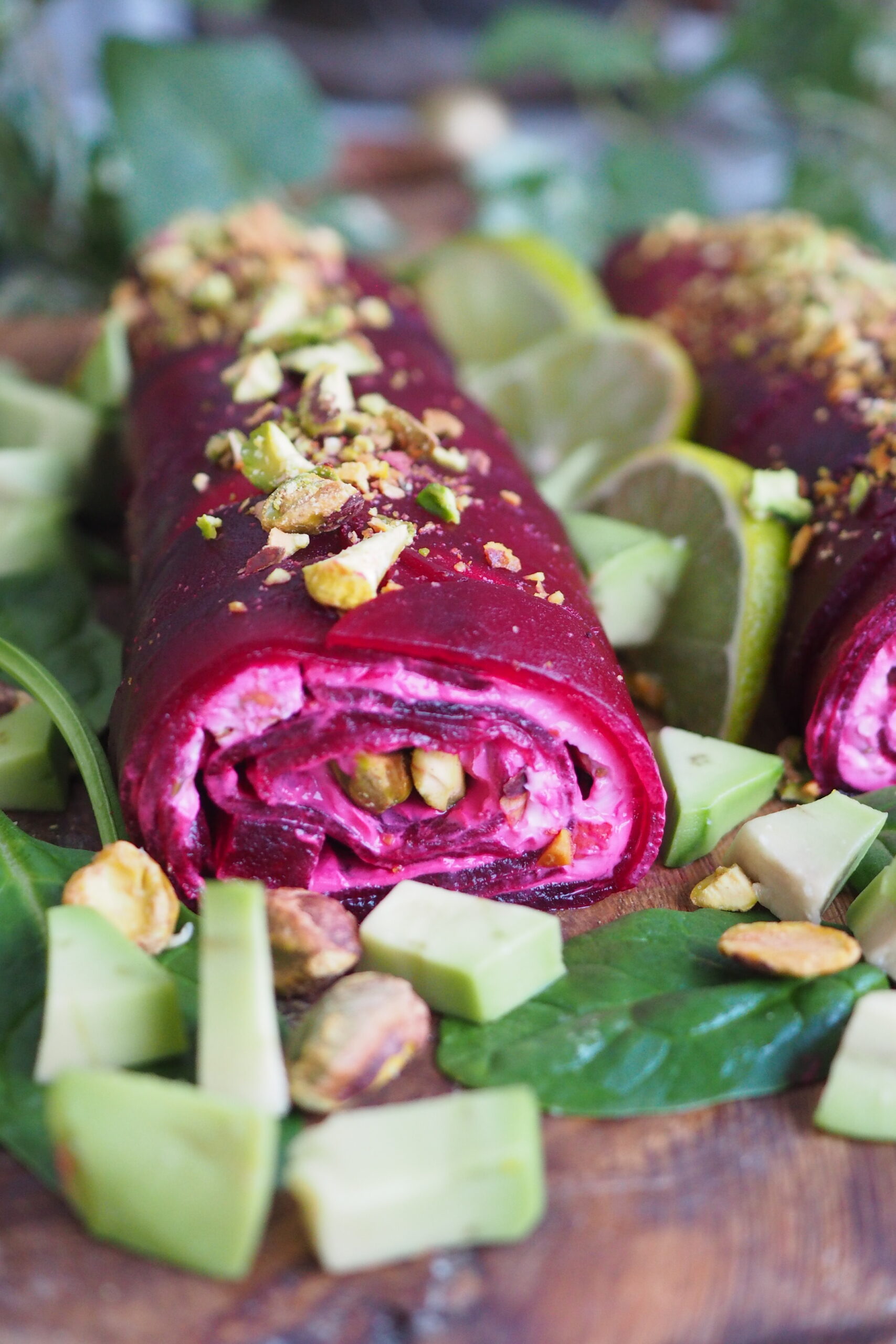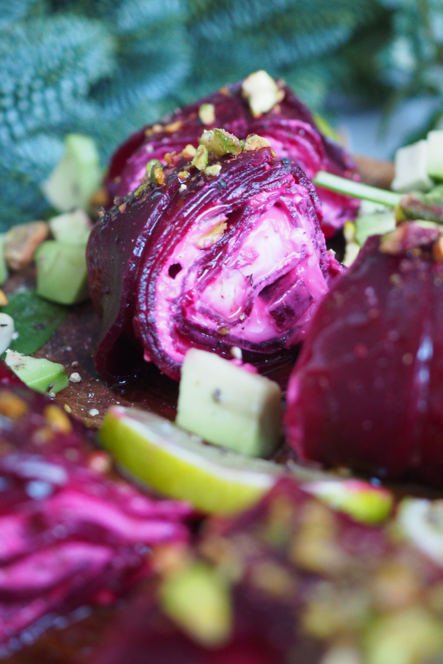 Jeśli szykujecie się na imprezę sylwestrową i szukacie pomysłu co przygotować, to proponuję takie kolorowe roladki z buraka, serka koziego i pistacji.