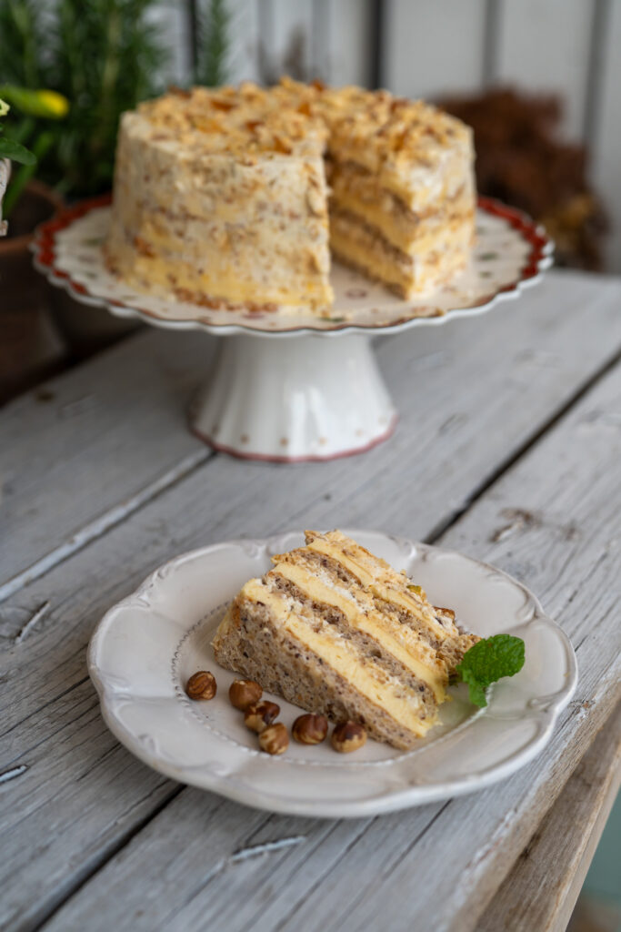 Bardzo elegancki, orzechowy i kremowy tort egipski.