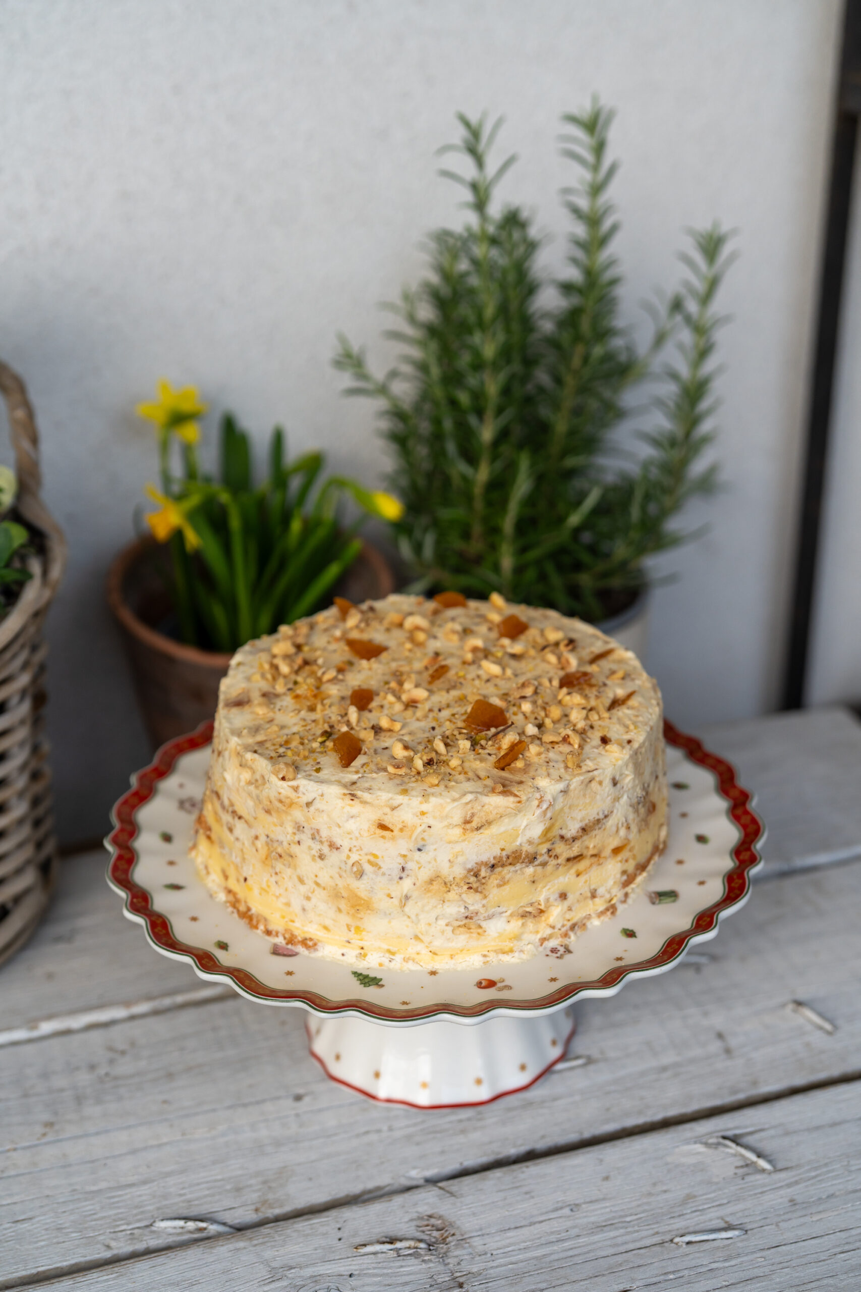 Bardzo elegancki, orzechowy i kremowy tort egipski.